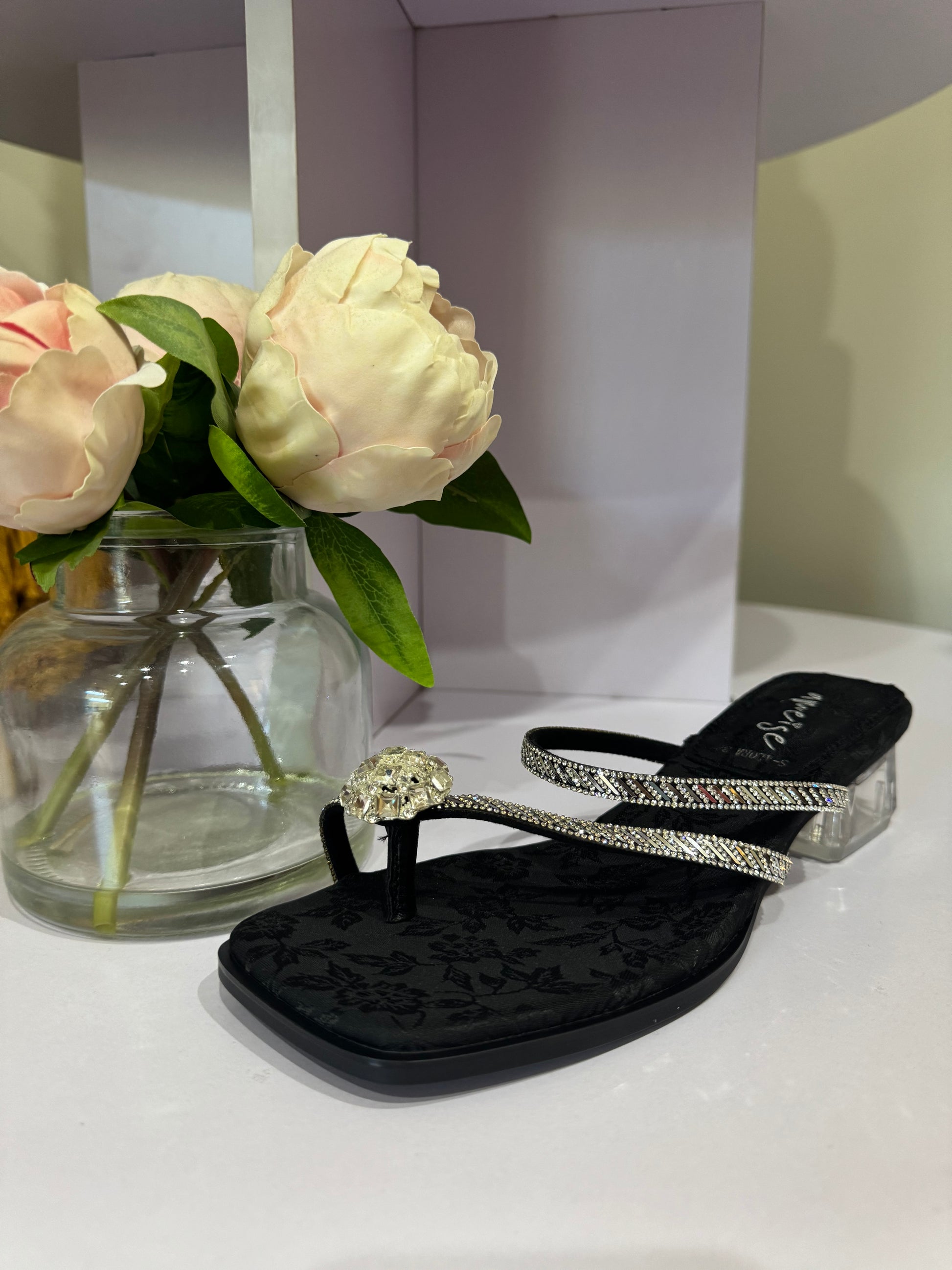 Features a velvet featured soul with jewelled and beaded accents with a beautiful jewelled toe, square flat heel with a matching squared toe area.