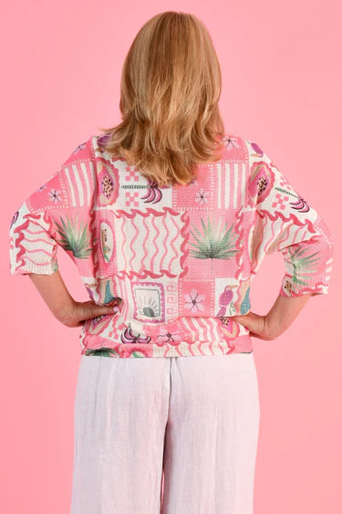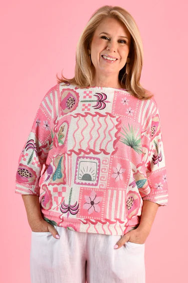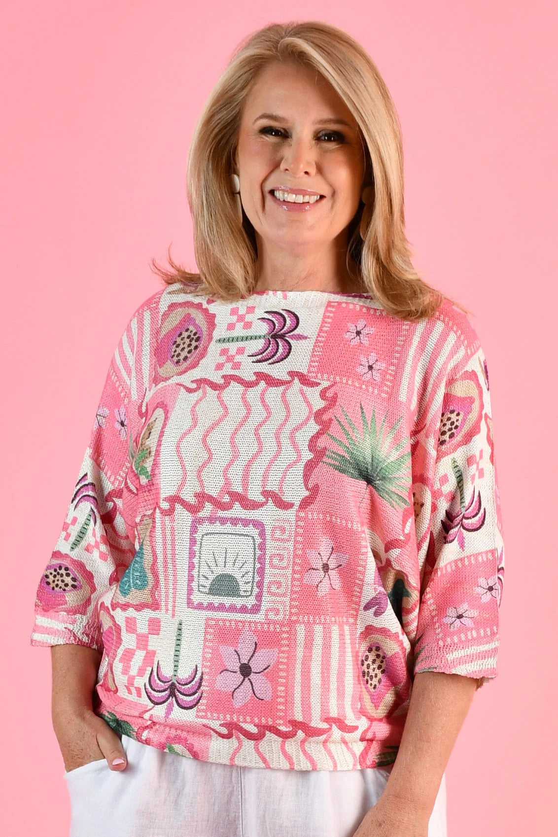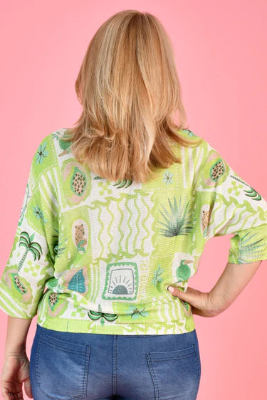 This knit top features an eye-catching green palm or pink springs pattern, enhanced with metallic details for a touch of shimmer. Made from a comfortable poly blend, it's a stylish and versatile addition to any wardrobe.
