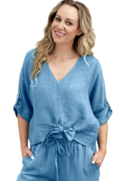 Made from light and breathable linen for the summer, this short sleeve with button tie up sleeve, shirt features an easy popper fastening with tie detailing to the hem, finished with a V neckline.