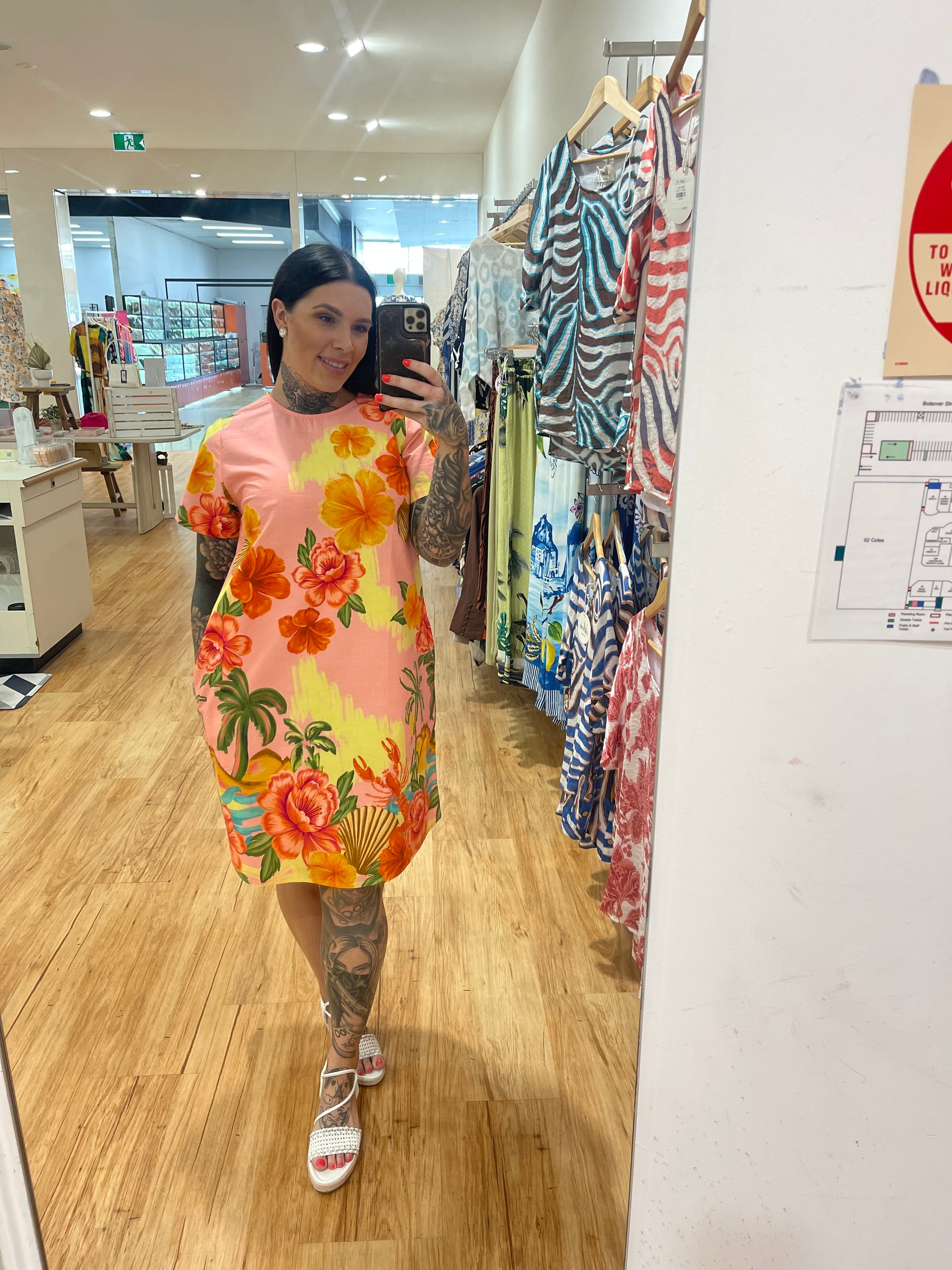 Short sleeve shift dress with round neck, back keyhole button fastening, knee-length. The colours are just Wow, stand out and shine in this gorgeous new Dress
