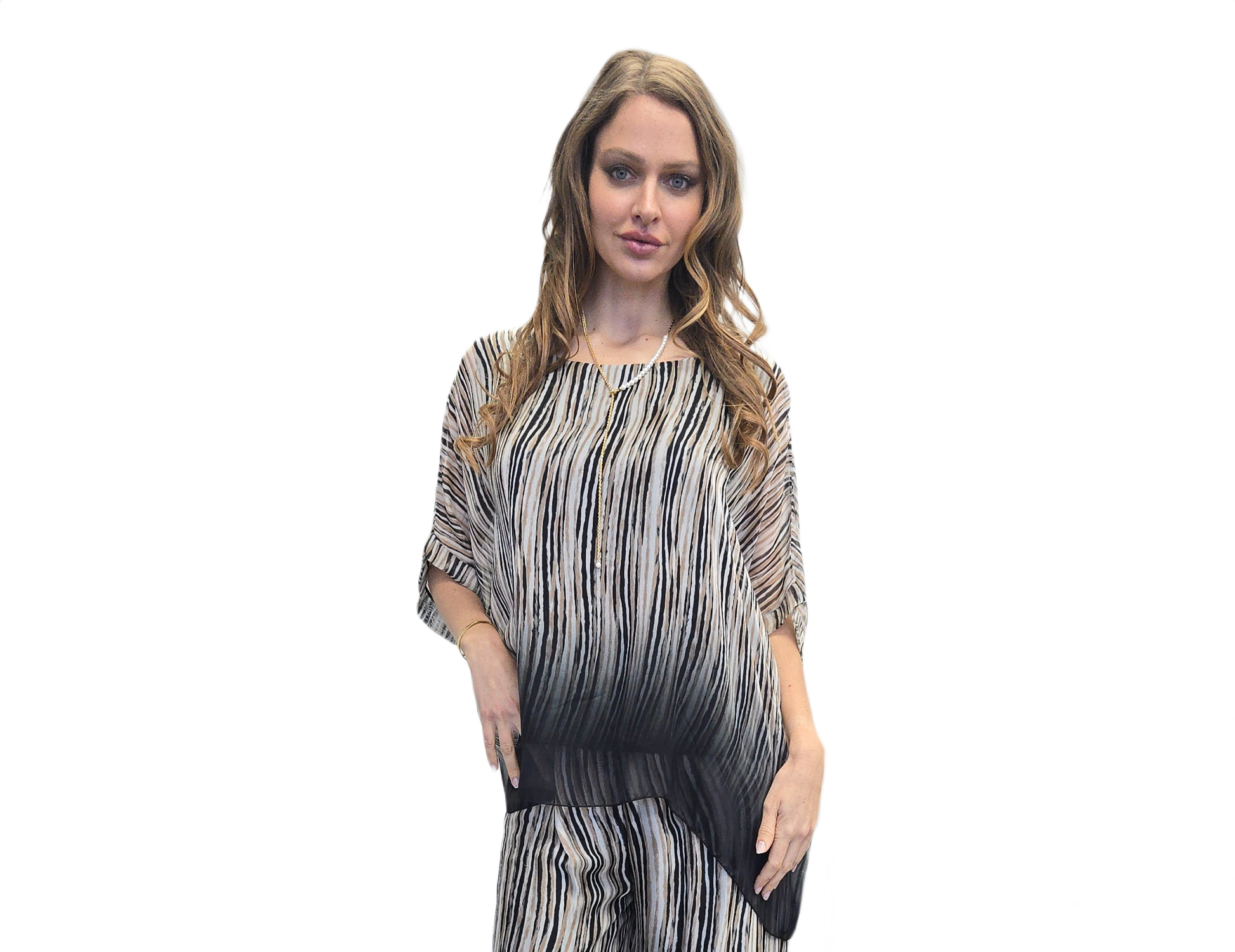 featuring a vertical stripe pattern. The Top is loose-fitting and flowy, Italian silk blouse with a round neck and short sleeves. Pair her with the matching bottoms or wear her with your favourite bottoms