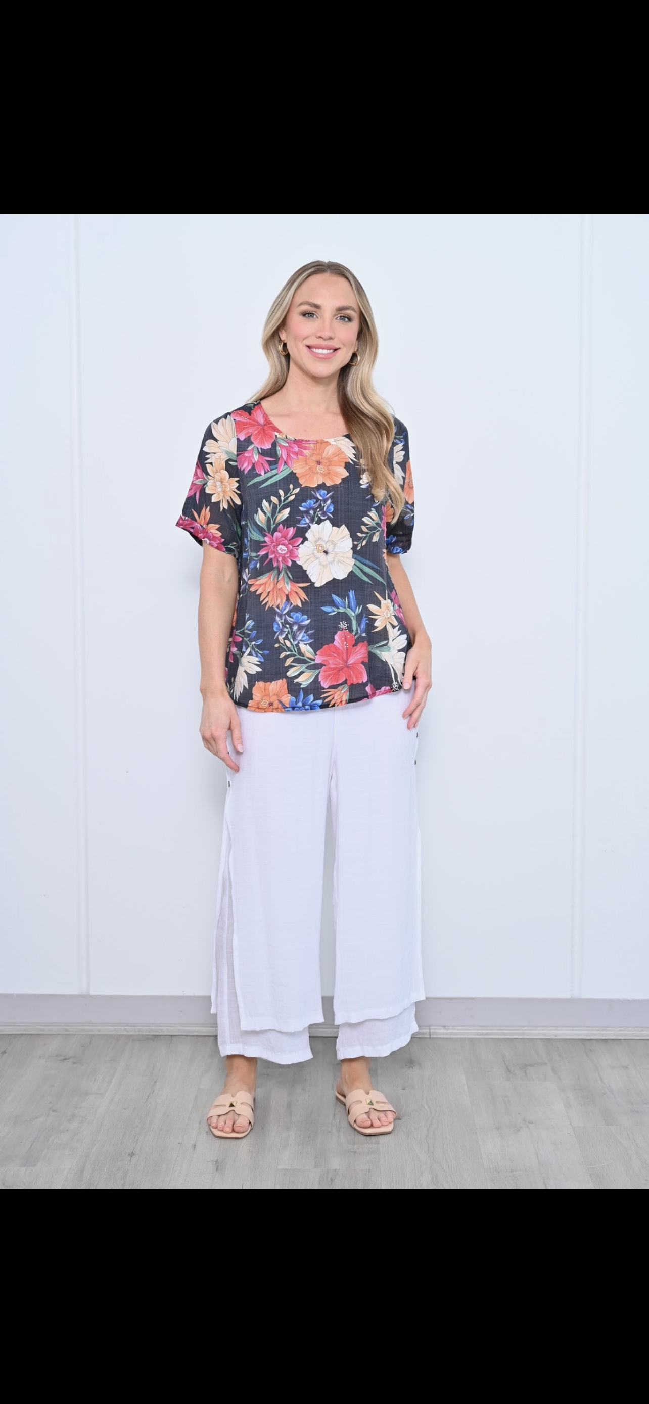 The popular Dani Top now comes in a gorgeous floral prints on white base. Cut from soft fabric, with half length sleeves, side buttons and a curved length at back. A notch above your average casual top, this would be an easy option to dress up for the evening!
