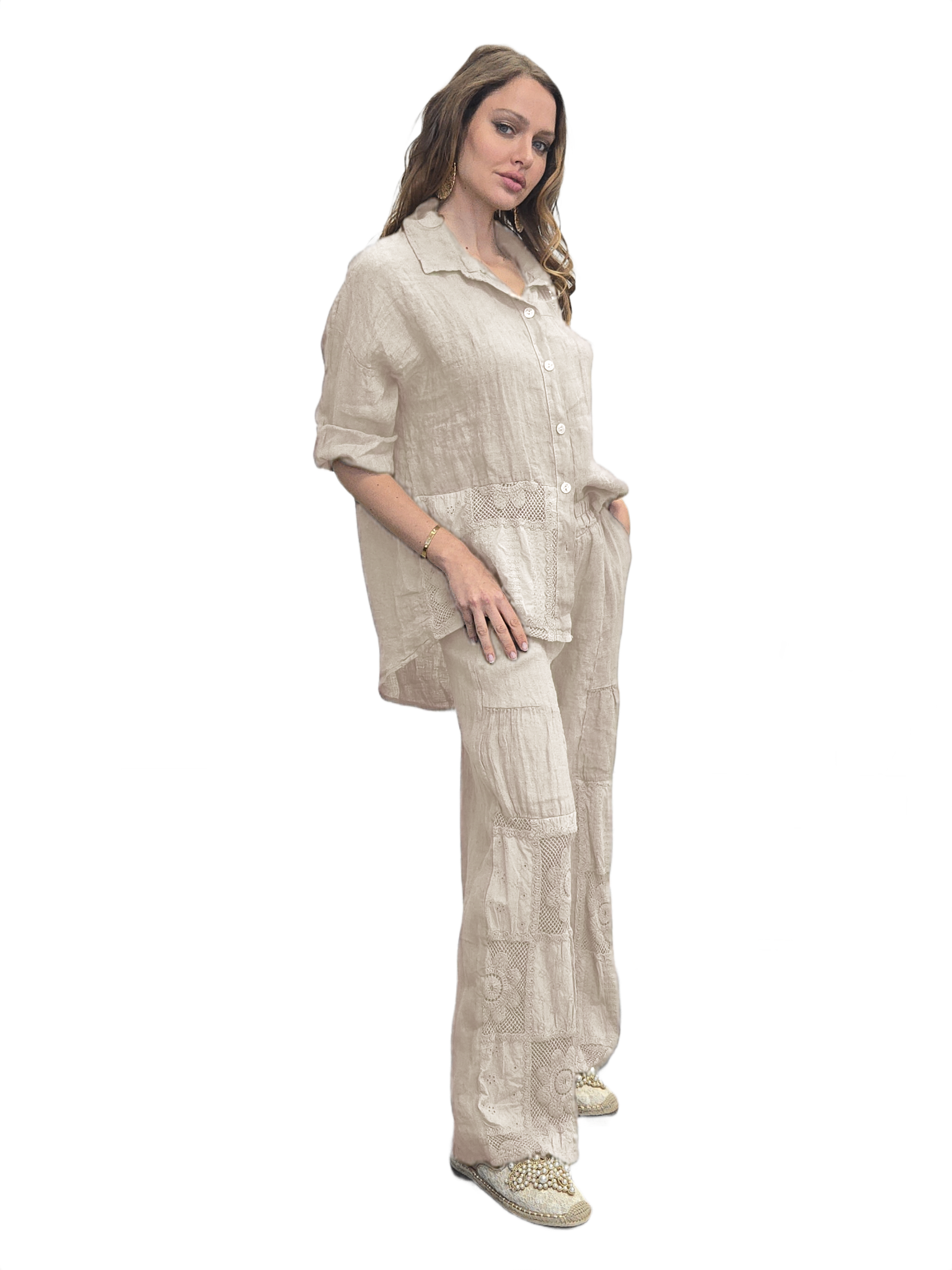 Crafted from high-quality linen fabric, the top boasts a beautiful cutwork lace design and a flattering low back. The matching pants complete the outfit, providing a cohesive and stylish look.