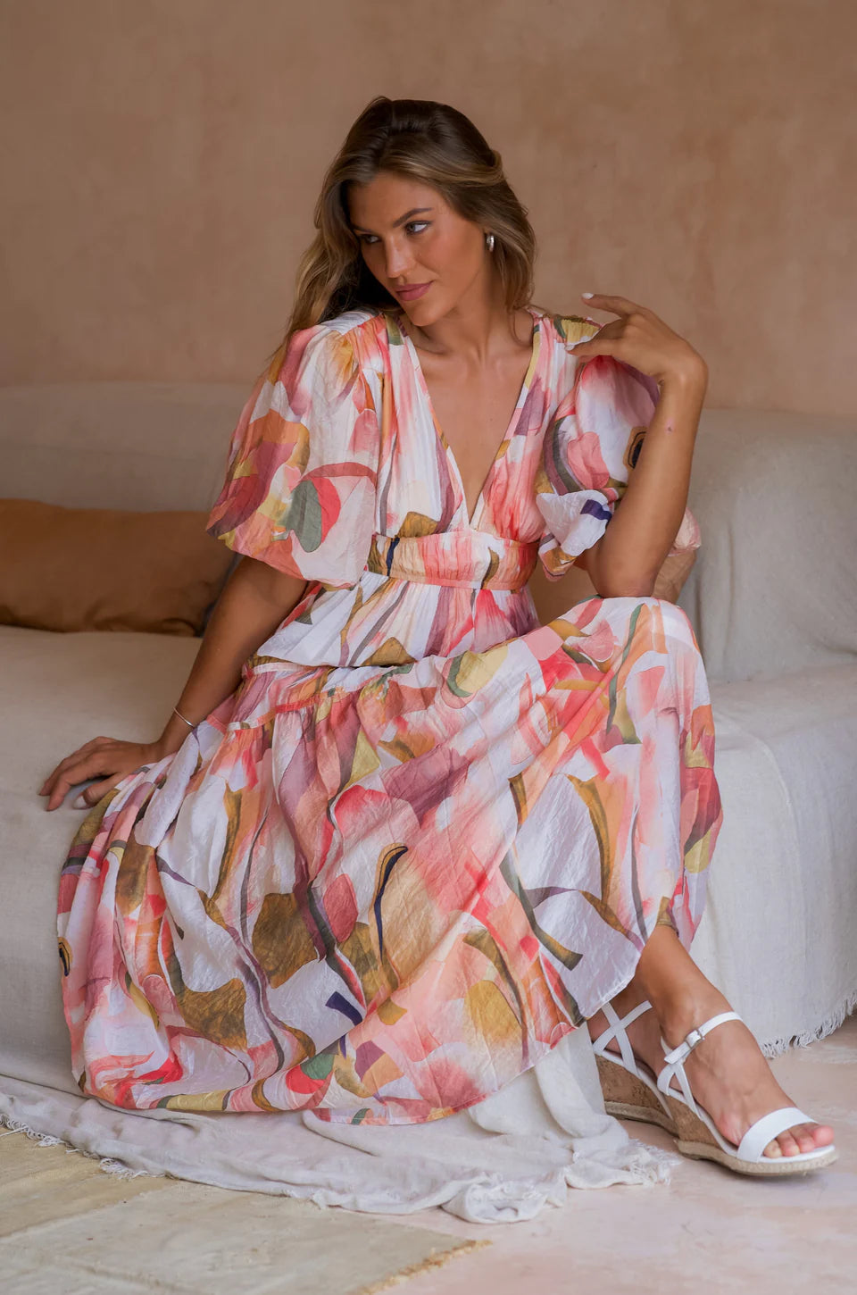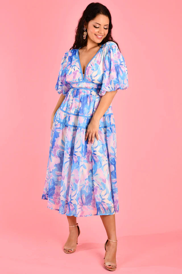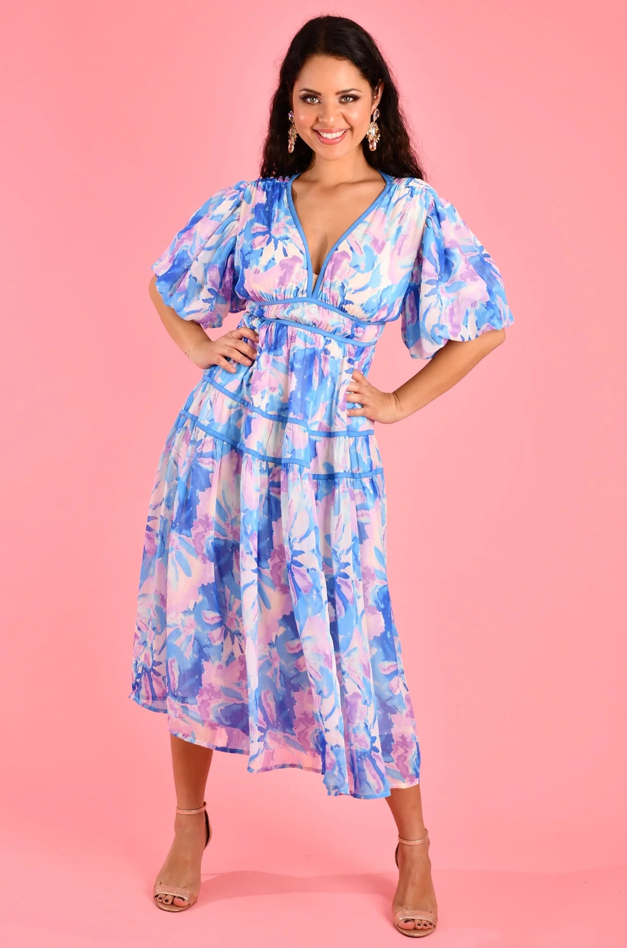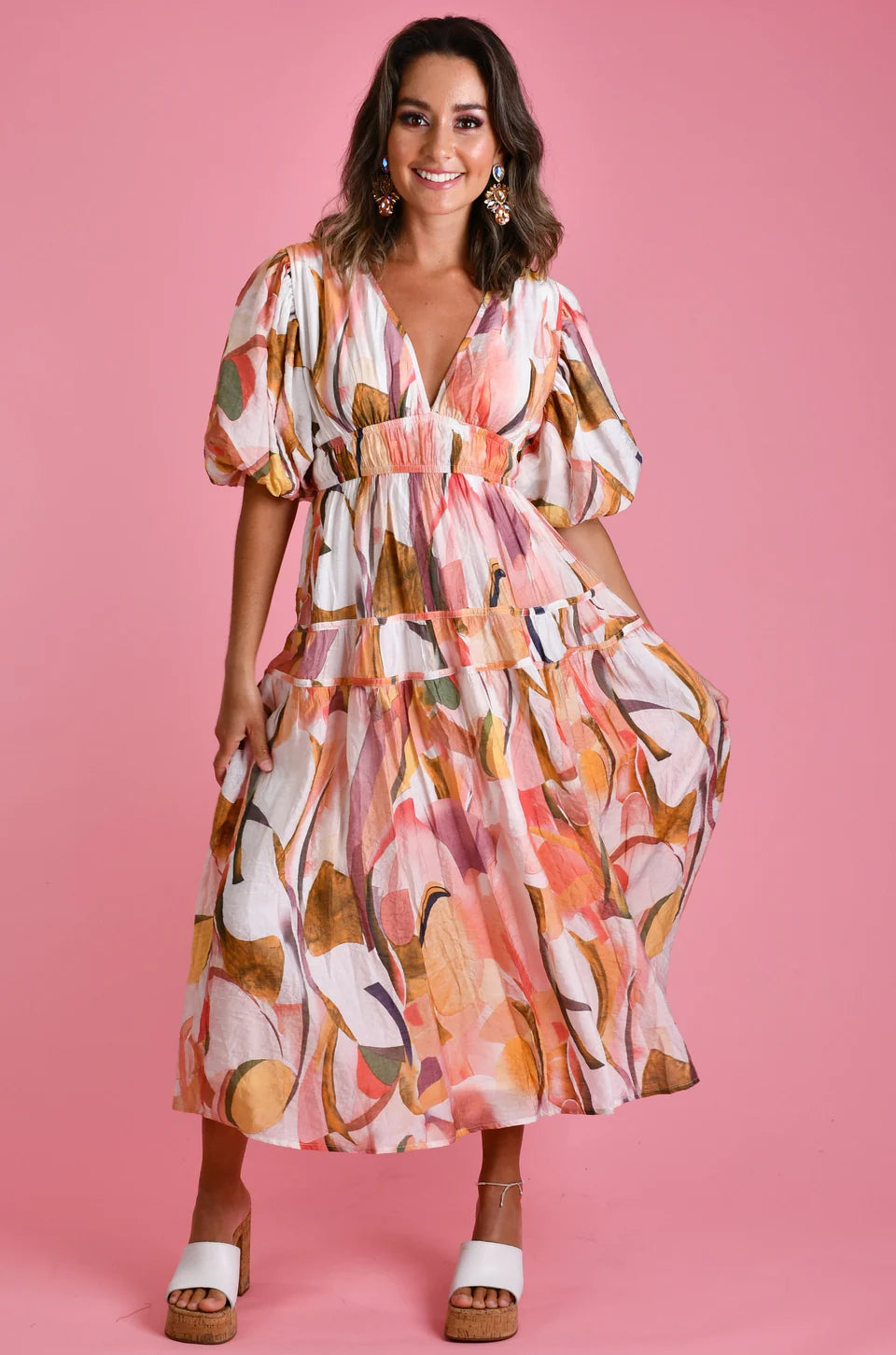 Step into a fairytale with our Pandora Dress, featuring the dreamy, Soft, Print .