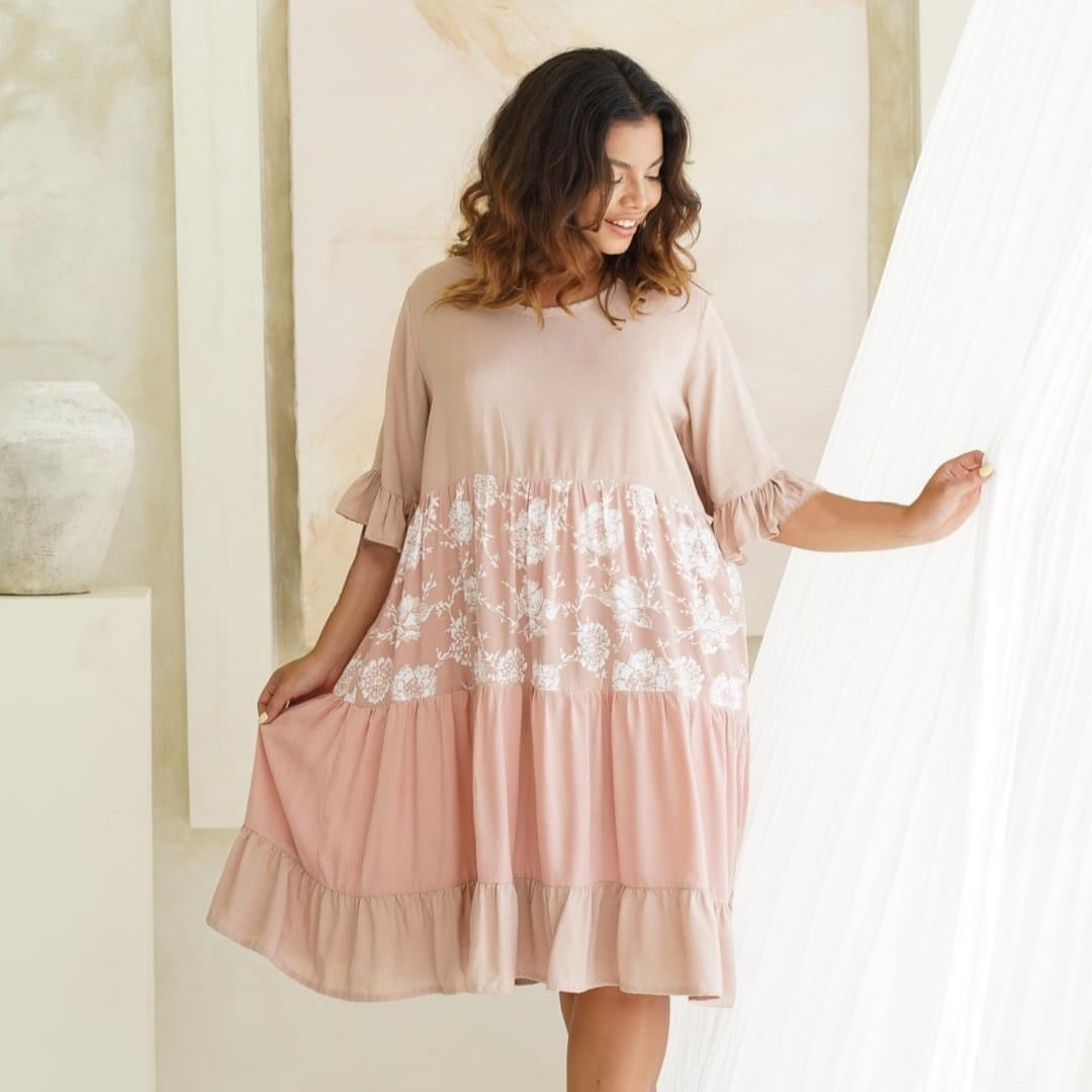 This tired three tone dress has beautiful frilled sleeve detail that we just Love! Knee Length for most