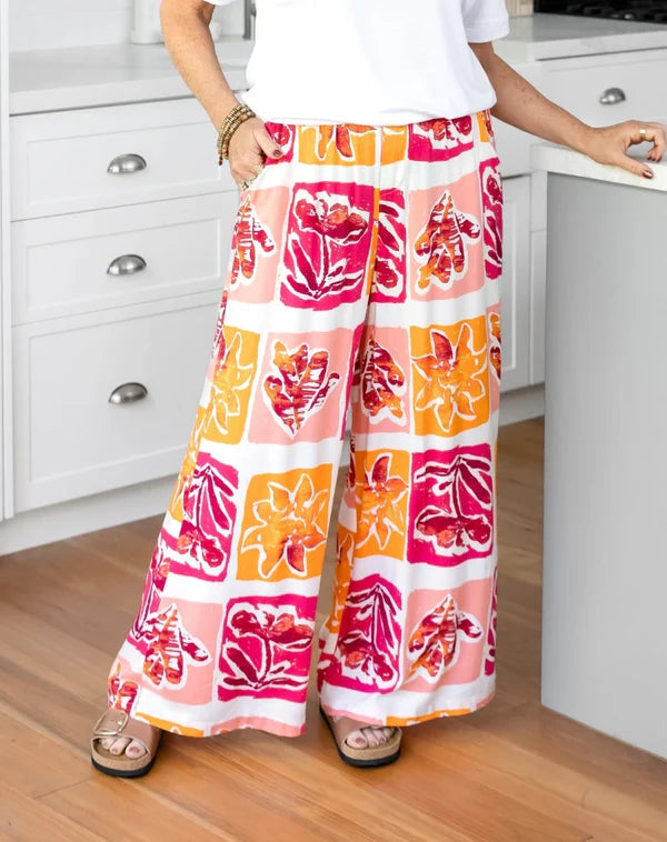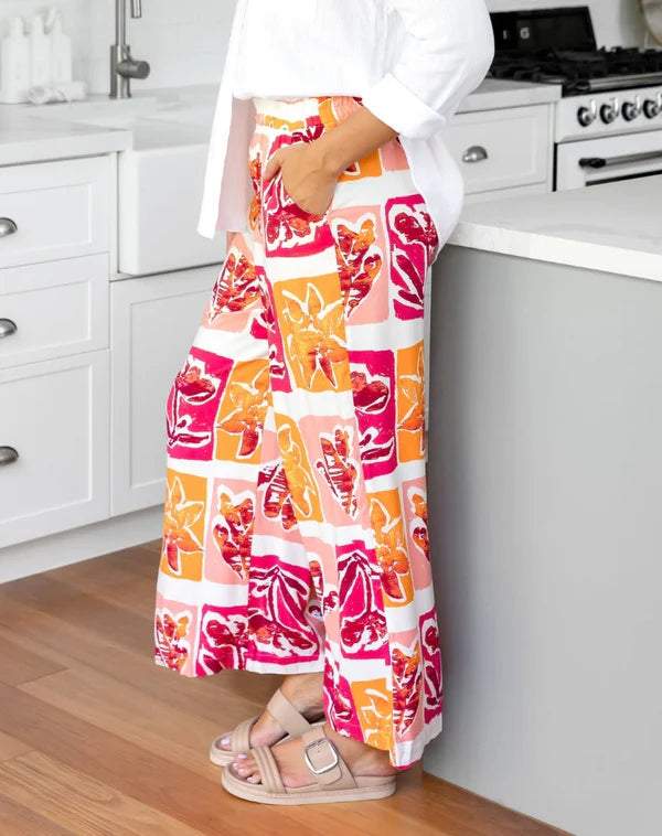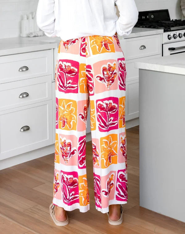 Postcard Pants feature a bold floral print in vibrant shades of pink and orange. These lightweight pants have a relaxed fit and an elastic waistband, making them perfect for warm weather. Pair them with a simple tee or a our Cotton Shirt for a stylish, effortless look.