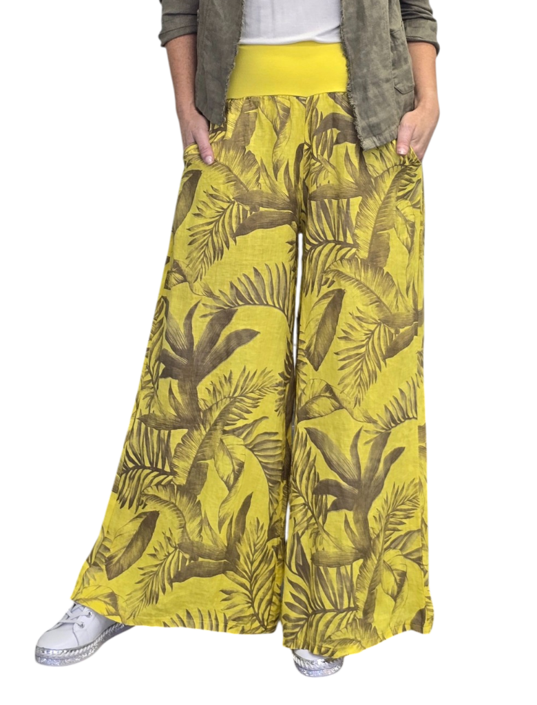 - Crafted in Italy with an expansive waistband and a luxurious blend of 90% linen and 10% cotton, these pants boast practical front pockets and a wide-legged silhouette.