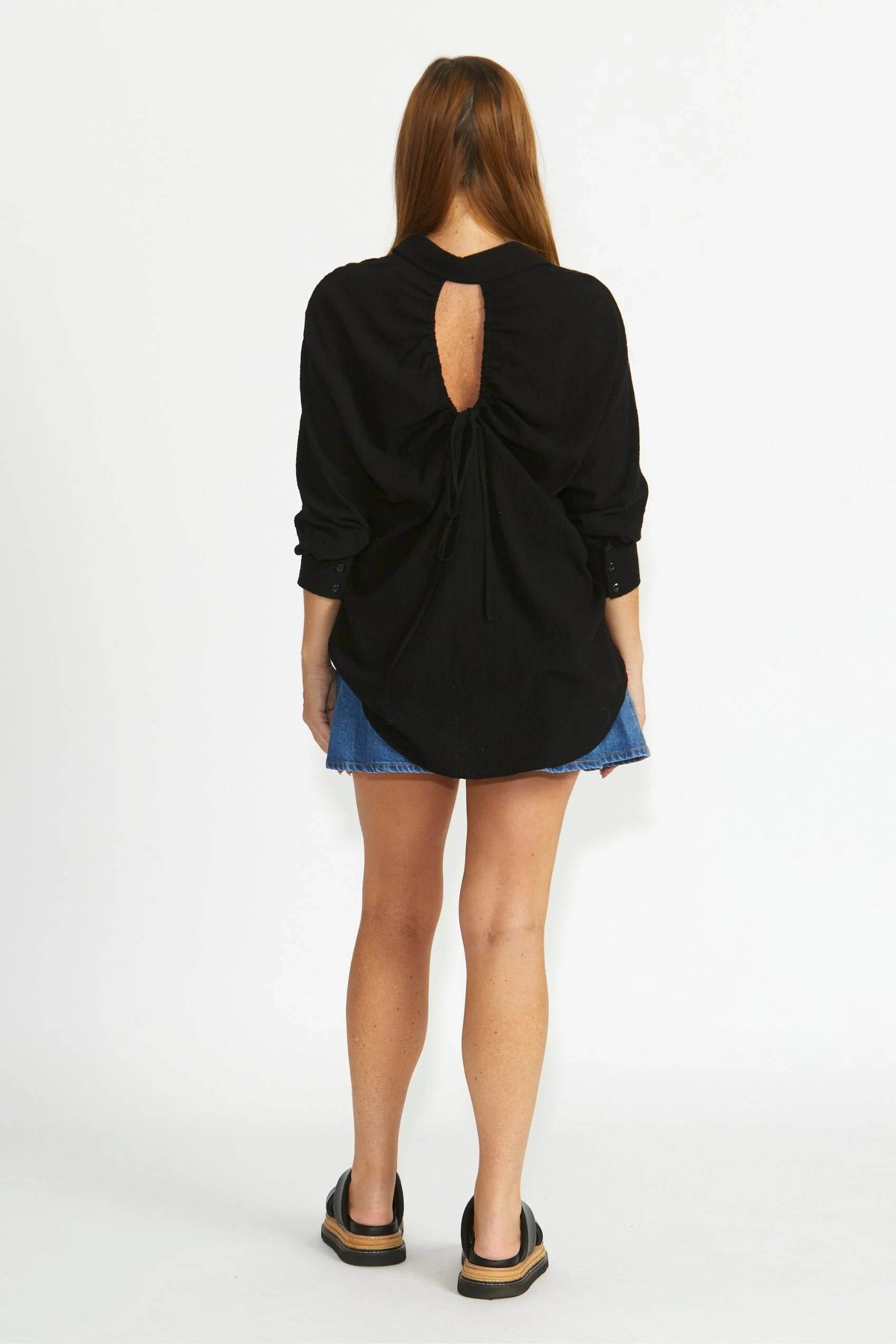 A long-sleeve button-up shirt in soft viscose crinkle, offering a fluid drape and airy comfort. The Sara Shirt works effortlessly tucked, untucked, or layered over dresses and tanks.