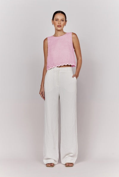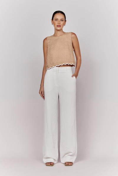 Details: Linen-Cotton Blend Perfect for everyday wear with its sleeveless design and a button at the back, this crop top boasts style and practicality. The delicate scalloped hem adds a touch of fun to any outfit.