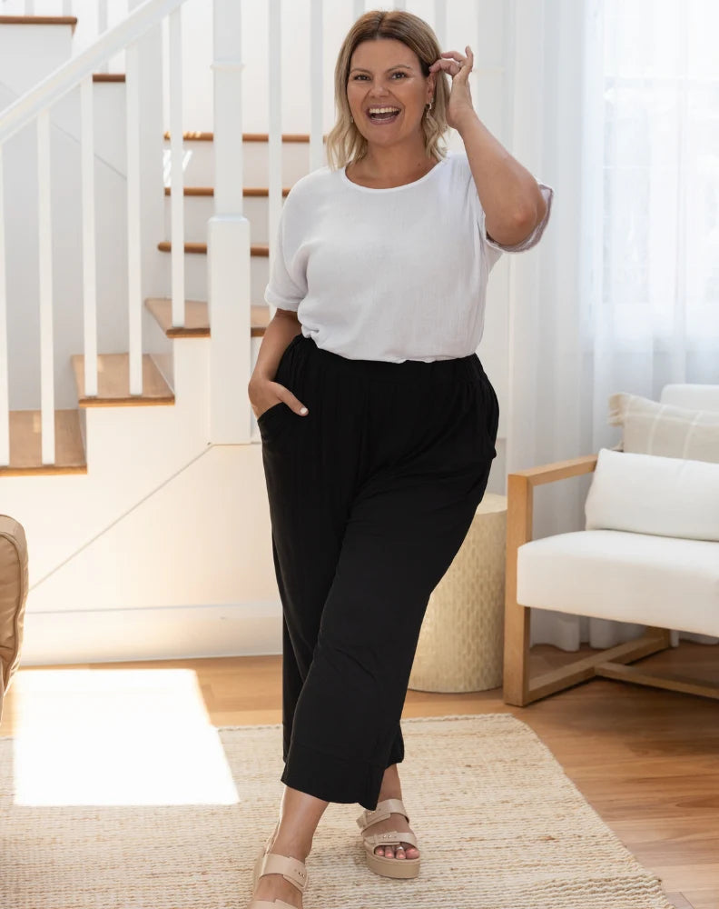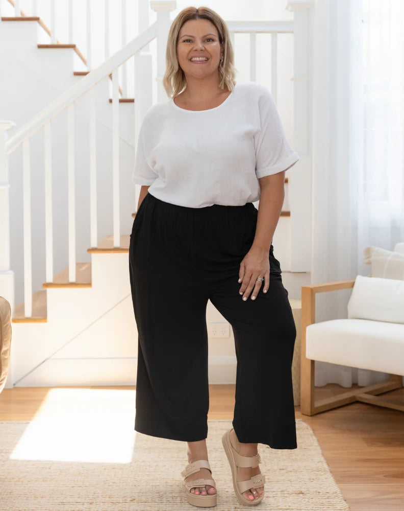 Look effortlessly chic in our new Stella Pant. An on-trend cropped wide leg pant fabricated in a super comfortable & soft wear-all-day fabric. Features include an elasticised waist, pockets, cuff detail and relaxed wide leg. Perfect to style with our Freez lounge range.