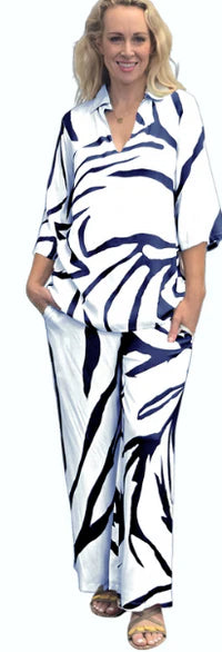 Make a statement with the Supre Top – a bold, relaxed-fit piece designed for both comfort and impact. Featuring a striking navy and white abstract print, this top is cut with wide half sleeves and a soft collar with a V-neckline for an effortlessly chic look, it’s perfect for day-to-wear with your favourite jeans, trousers, or shorts.
