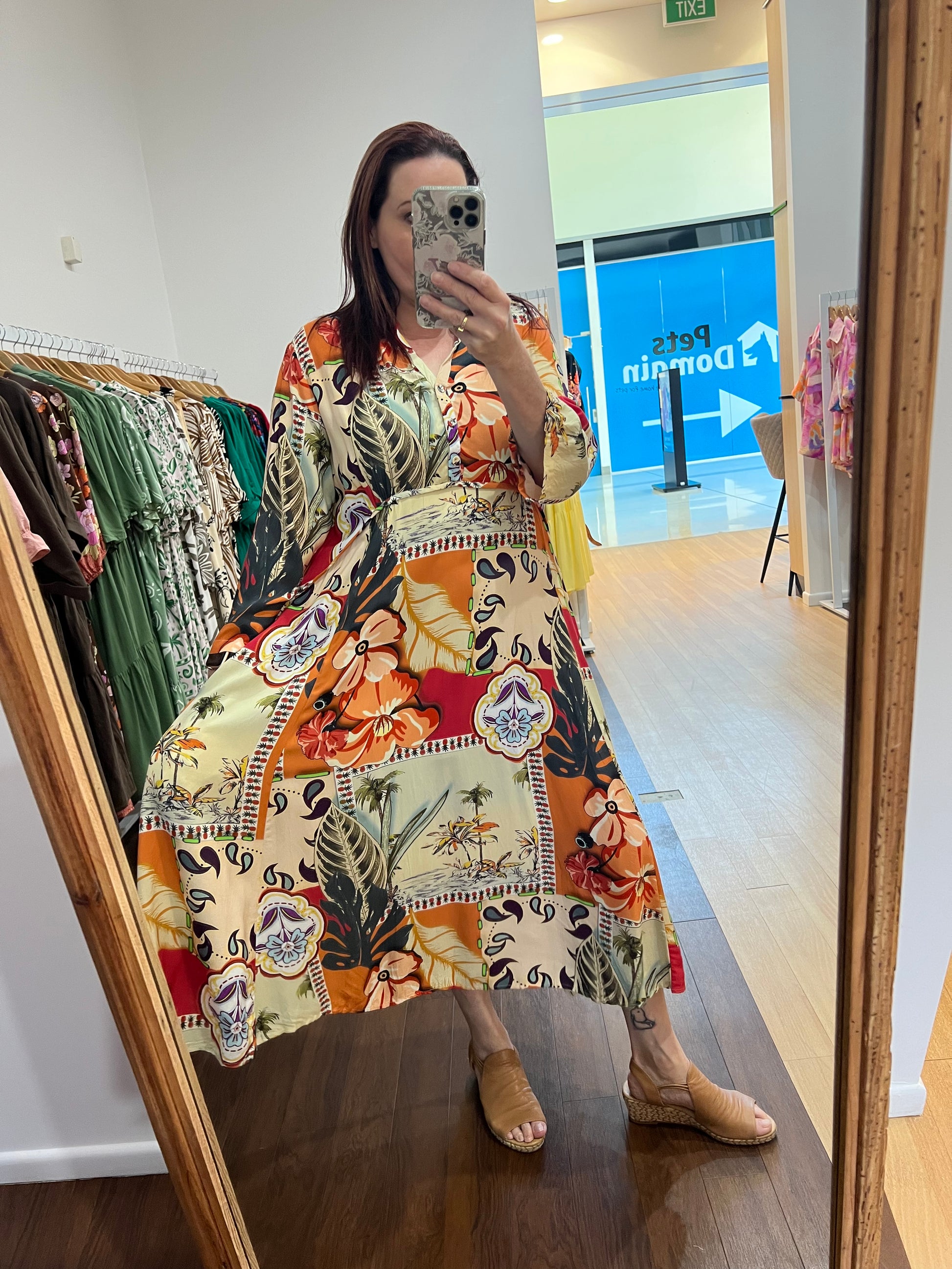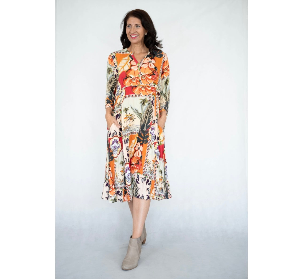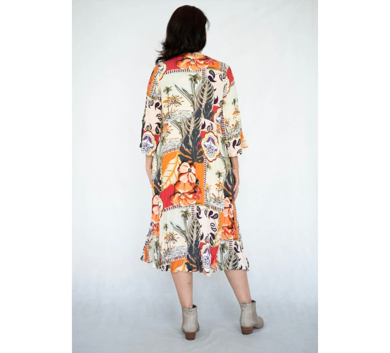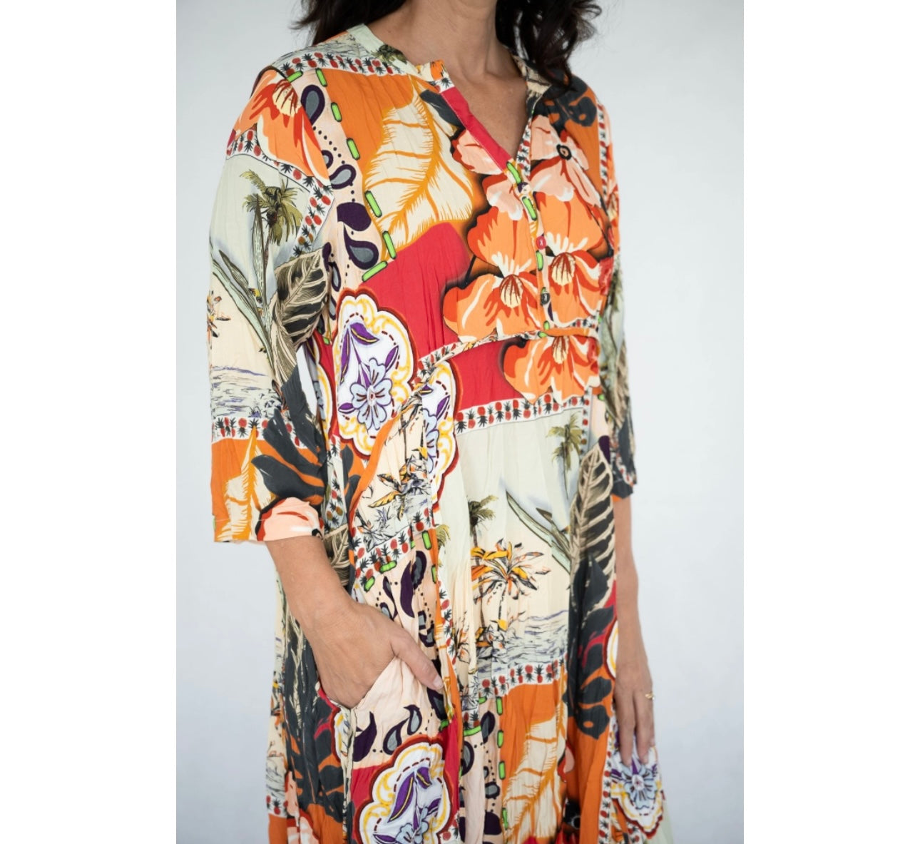 The Annabel Dress is a standout piece designed for effortless, everyday style. Featuring a striking tropical patchwork print in warm, complementary tones, this midi dress offers both comfort and versatility. The button-up front and relaxed three-quarter sleeves create a flattering silhouette, while the lightweight fabric ensures breathable all-day wear. Complete with practical side pockets, the Annabel Dress is perfect for casual outings, weekends, or resort-style dressing.